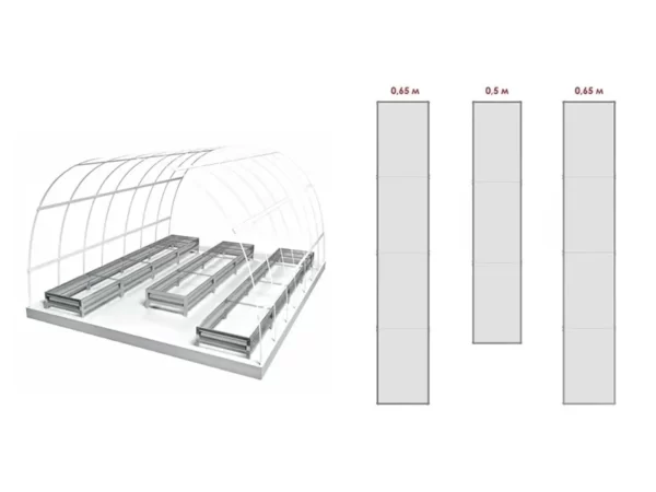 Размеры грядок изготавливаются с учетом фундамента и размеров теплицы. Ширина боковых грядок по 65 см, центральная грядка 50 см. Длина боковых грядок на 25 см меньше длины теплицы, чтобы легко установить грядки в теплицу с любым фундаментом. Длина центральной грядки на 1 метр меньше длины теплицы, для удобства входа в теплицу.